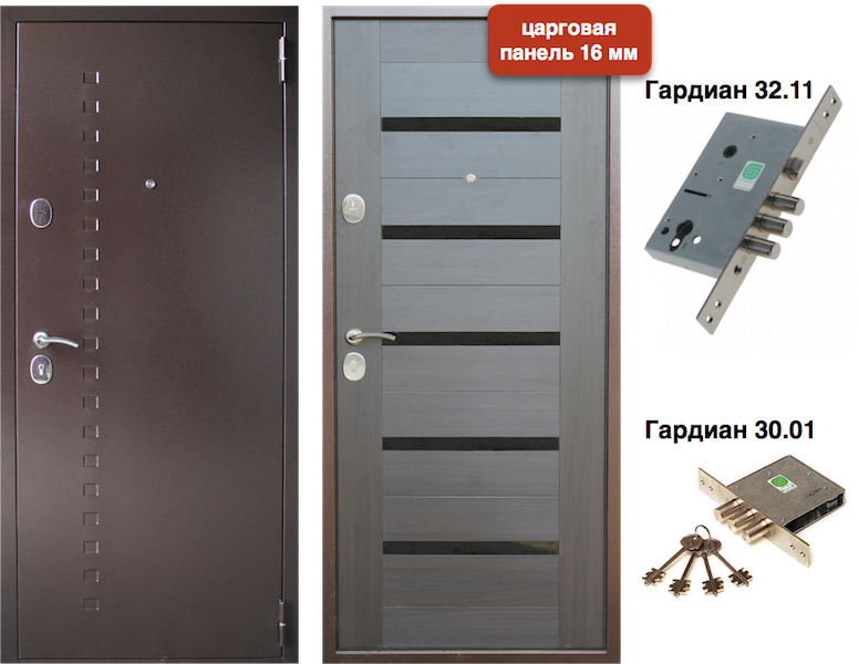 Комплектуется раздельной ручкой цвета хром, глазком широкого обзора цвета хром, петли: 2 шт., наружные, открывание 180°. Основной замок цилиндровый Гардиан 32.11