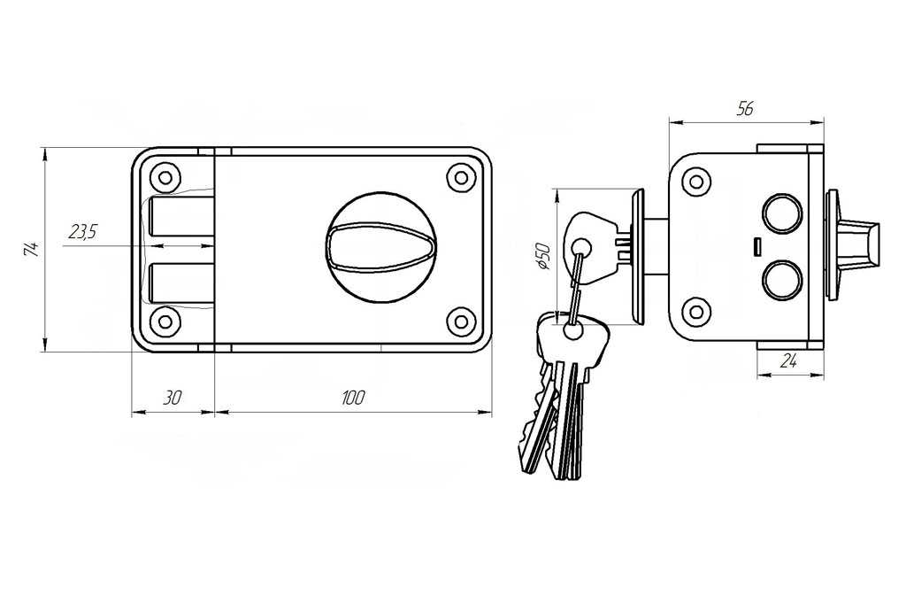 Замок накладной ЗН 1-3-1 предназначен для деревянных и металлических дверей. Корпус замка выполнен из ударопрочного АБС-пластика со стальной пластиной, ригели из стали. Имеется блокировка открывания двери ключом снаружи. Изнутри замок запирается ручкой. 2 класс секрета. Количество секретных комбинаций: 15 000. Два ригеля диаметром 14 мм. Цвет: медь. Комплектация: замок, цилиндровый механизм МЦ-1, 4 английских ключа, ответная планка, 1 накладка, крепежная фурнитура.