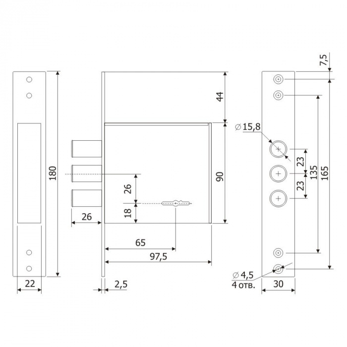 ---Замок врезной универсальный хром ГАРДИАН 30.01 малый длинный ключ