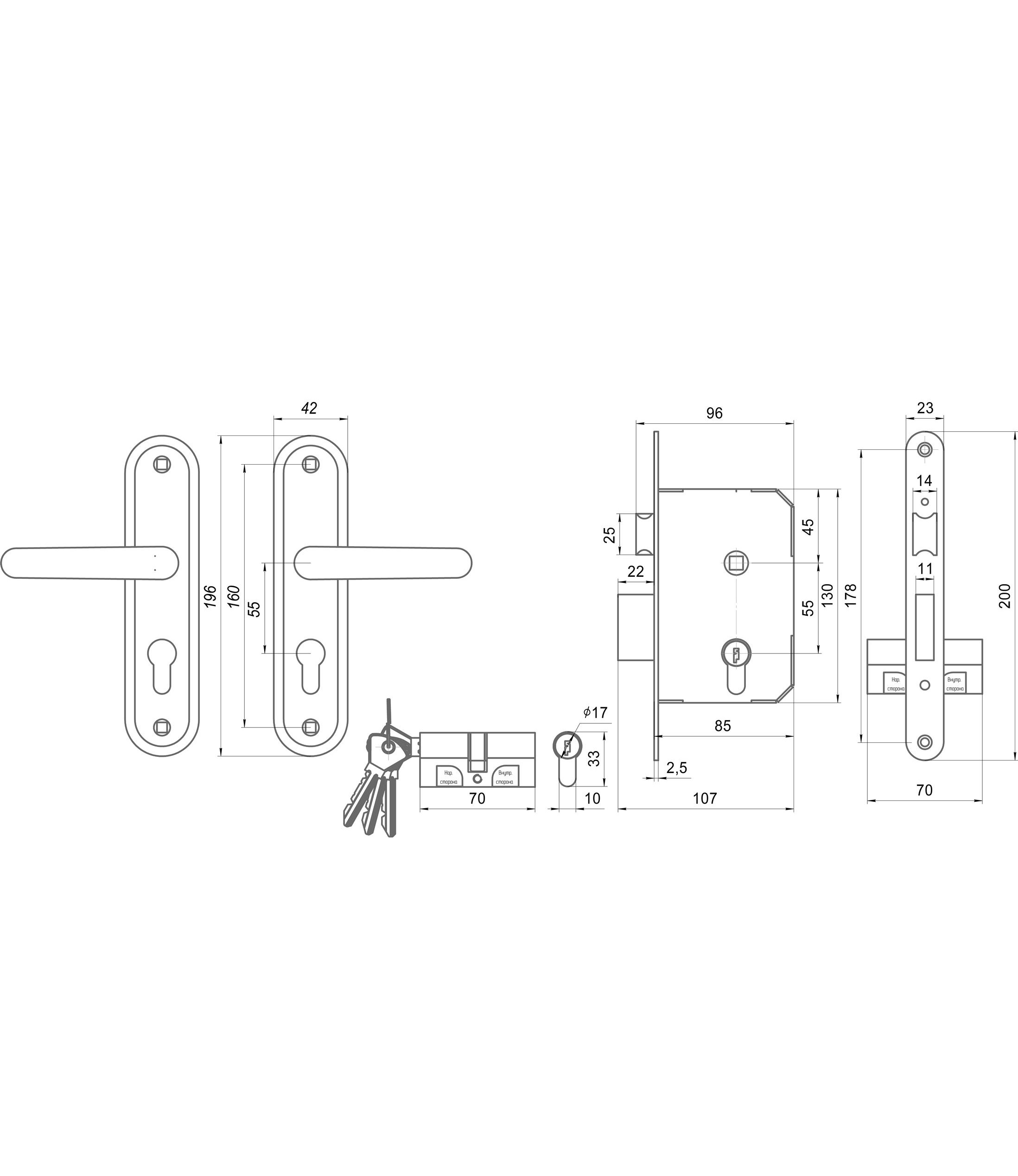 ОписаниеЗамок врезной цилиндровый ЗВ7.02 с ручками предназначен для установки в деревянные и стальные двери толщиной до 50 мм, левого и правого открывания. Ручки-накладки покрыты полимерной краской. В ручки фалевые добавлены пружины и фиксаторы, что исключает провисание ручек и обеспечивает четкую фиксацию их положения. Прямоугольный ригель. Ригель и защелка выполнены из цинкового сплава. Межосевое расстояние 55 мм. Комплектуется цилиндровым механизмом 70 мм, 4-мя ключами, ответной планкой и крепежной фурнитурой. Цвет: медь.