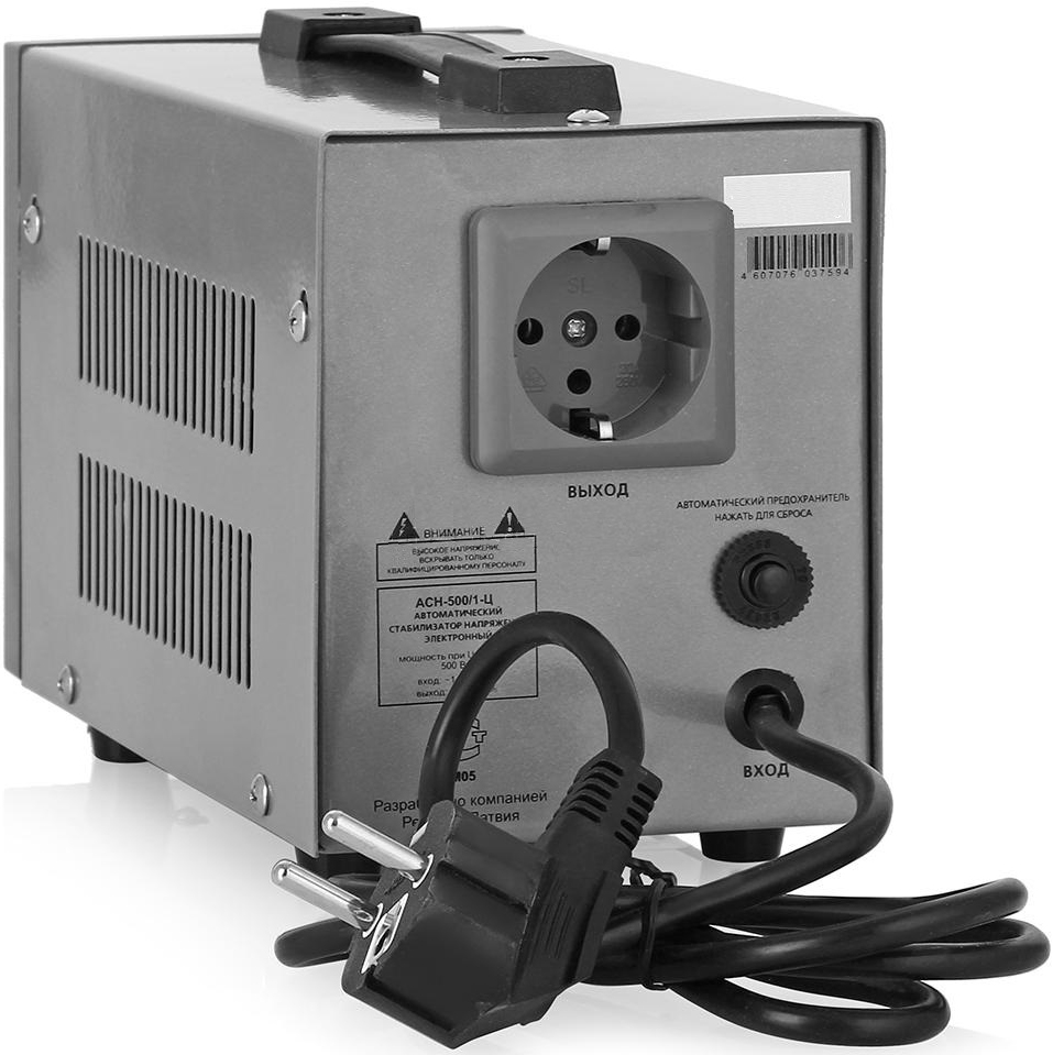 Стабилизатор напряжения Ресанта АСН 500/1-Ц релейного типа предназначен для выравнивания входного напряжения и защиты приборов от перепадов напряжения с суммарной мощностью до 0,5 кВт. Работает с напряжением 220В с точностью до +/-8%. Устройство оснащено фильтрами сетевых помех, предотвращающими искажение частотной синусоиды, микропроцессорным управлением и цифровым индикатором напряжения, на котором отображаются параметры напряжения. Превышение пределов поддерживаемого входного напряжения автоматически отключает подачу питания. Прочный корпус защищает внутренние узлы аппарата от повреждений. Данный стабилизатор может обеспечивать стабильным питанием - телевизор, ресивер, DVD проигрыватель, кассовый аппарат, газовый котел.