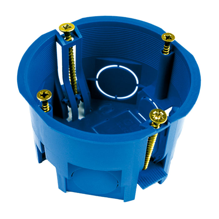 Коробка распределительная круглая для стен из гипсокартона (для скрытой проводки). Данный вид продукции используется в комбинации с гофрированными или гладкими трубами для разветвления кабелей, проводов и установки электроустановочных изделий евростандарта с межвинтовым расстоянием 60 мм. Коробка врезается в полые или гипсокартоновых стены, крепление самонарезными винтами с лапками.