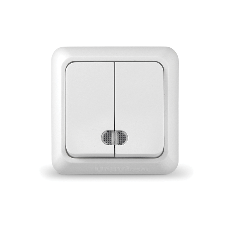 ---Выключатель двойной открытой установки 10А с подсветкой белый UNIVersal Олимп