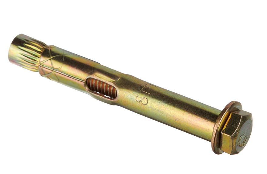 Анкерный болт используется для сквозного монтажа конструкций в полом кирпиче и легких видах бетона. Продольные разрезы на разжимной гильзе делят ее поверхность на четыре лепестка, которые под воздействием распорного элемента частично раскрываются, увеличивая размер поперечного сечения. Изготовлен из оцинкованной стали.