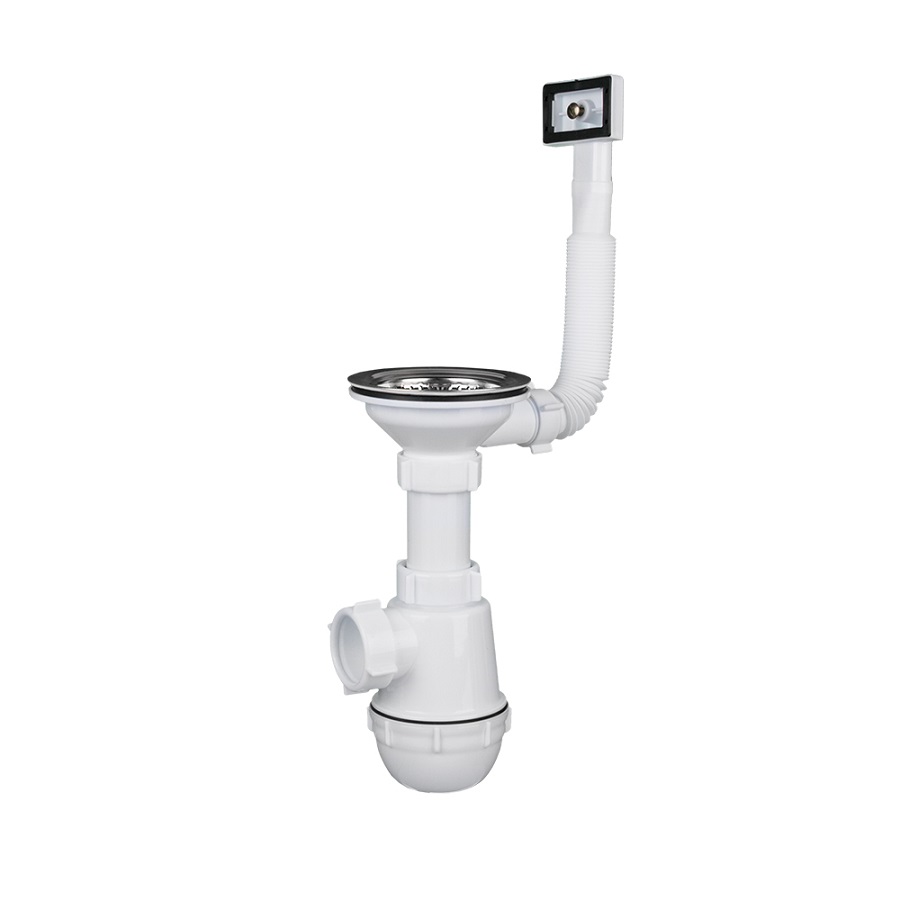 Сифон для кухонных моек с диаметром сливного отверстия 90 мм, бутылочного типа с увеличенным корпусом. С разборным выпуском и нержавеющей решеткой диаметром, с жестким прямоугольным переливом для моек из композитных материалов. Корпус перелива оборудован универсальной прокладкой для круглых и прямоугольных моек, нужная сторона прокладки достигается путем переворота. Гибкая труба в коплект не входит.