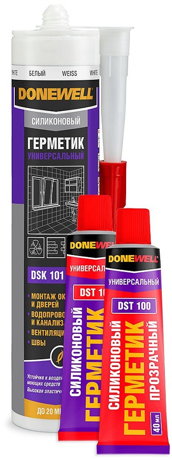 Высококачественный универсальный силиконовый герметик DONEWELL с системой отверждения ацетокси применяется в общих бытовых, ремонтных и строительных работах. Предназначен для уплотнения, соединения и защиты непористых поверхностей от проникновения воздуха и влаги; для герметизации оконных рам, дверных коробок, кабельных каналов; герметизации стыков при монтаже сантехнического оборудования, систем кондиционирования воздуха; защиты полиуретановой монтажной пены от УФ- лучей.