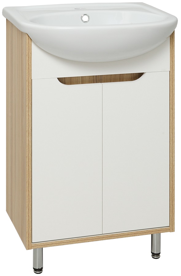 Тумба под умывальник на ножках с двумя распашными дверцами без ручек и одной внутренней полкой. Цвет корпуса: лиственница, цвет фасада: белый. Ножки хром - 2 шт, ножки пластик - 2 шт.