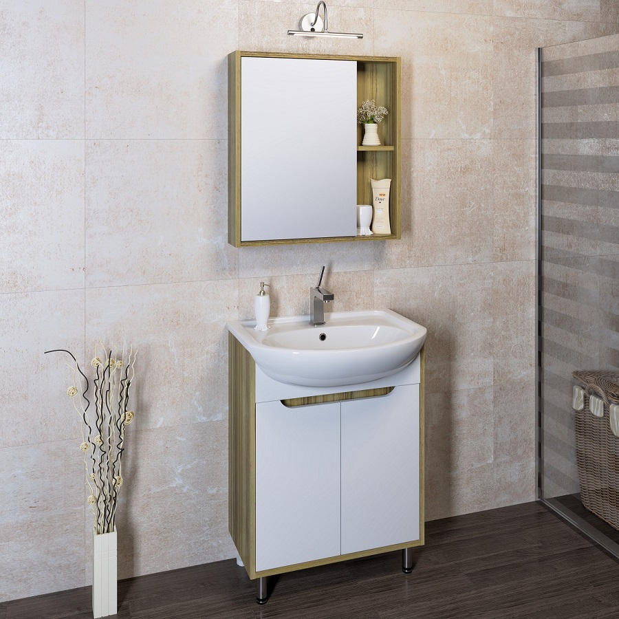 Тумба под умывальник на ножках с двумя распашными дверцами без ручек и одной внутренней полкой. Цвет корпуса: лиственница, цвет фасада: белый. Ножки хром - 2 шт, ножки пластик - 2 шт.