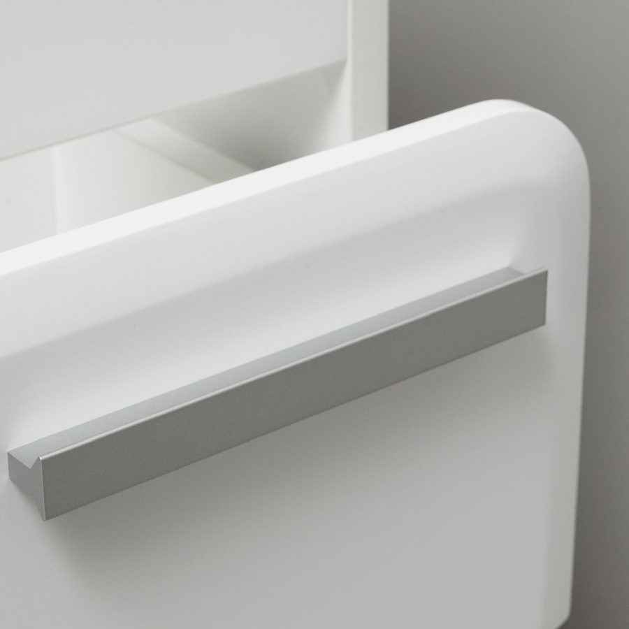 Тумба под умывальник на ножках с тремя распашными дверцами и одним боковым выдвижным ящиком (справа). Одна внутренняя полка. Петли со встроенным доводчиком, ящик на шариковых направляющих полного выдвижения. Ручки - 4 шт, ножки хром - 2 шт, ножки пластик - 2 шт.