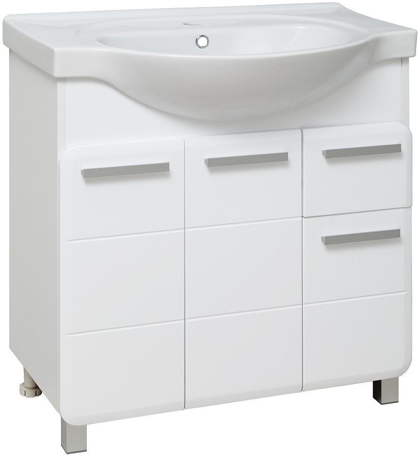 ОписаниеТумба под умывальник на ножках с тремя распашными дверцами и одним боковым выдвижным ящиком (справа). Одна внутренняя полка. Петли со встроенным доводчиком, ящик на шариковых направляющих полного выдвижения. Ручки - 4 шт, ножки хром - 2 шт, ножки пластик - 2 шт.