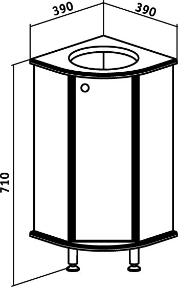 Тумба угловая на ножках с одной распашной дверцей и двумя открытыми полками слева или справа. За дверцей - одна внутренняя полка. Петли со встроенным доводчиком, ручка - 1 шт., ножки хром - 2 шт, ножки пластик - 1 шт. Выпускается в правом и левом исполнении.