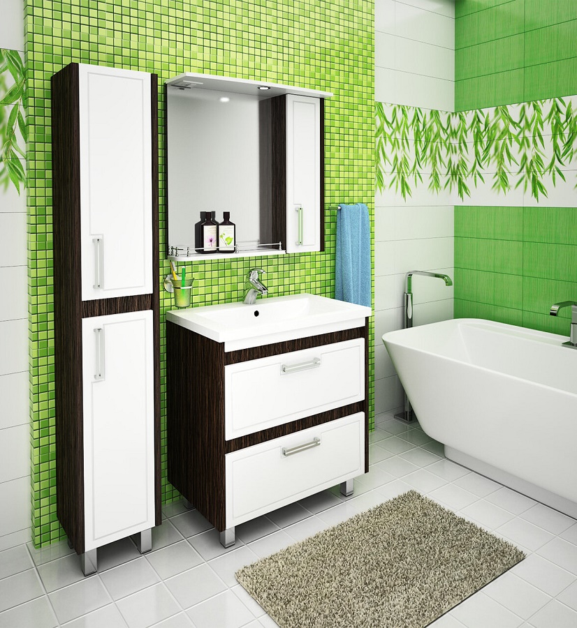 Зеркальный шкаф оборудован одним врезным светодиодным светильником 220В, розеткой с выключателем. Справа шкафчик с распашной дверцей и двумя внутренними полками. Нижняя полка с декоративным рейлингом. Цвет корпуса: венге, цвет фасада: белый. Петли со встроенным доводчиком, ручка врезная - 1 шт. Выпускается только в правом исполнении.