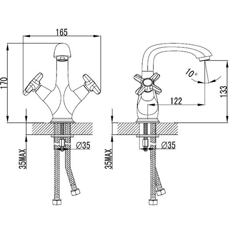 Двуручковый смеситель с керамическими кран-буксами (угол поворота - 180°). Аэратор Neoperl Cascade для равномерного распределения струи воды. Стойкое хромированное покрытие смесителей. Настольные смесители в комплекте с гибкой подводкой G 1/2'.